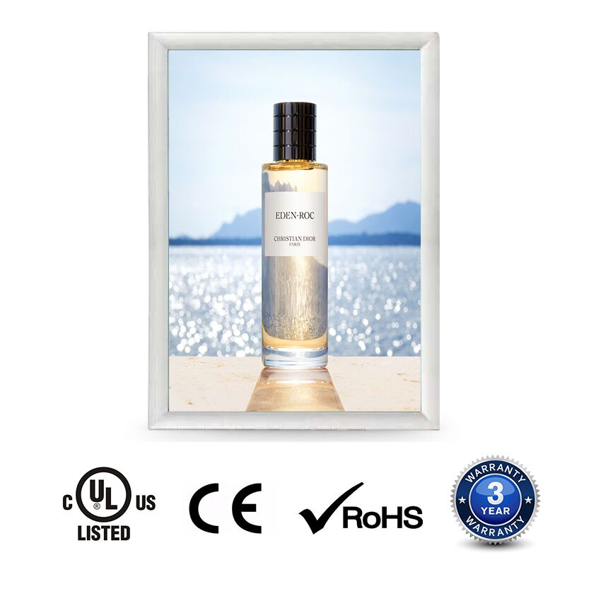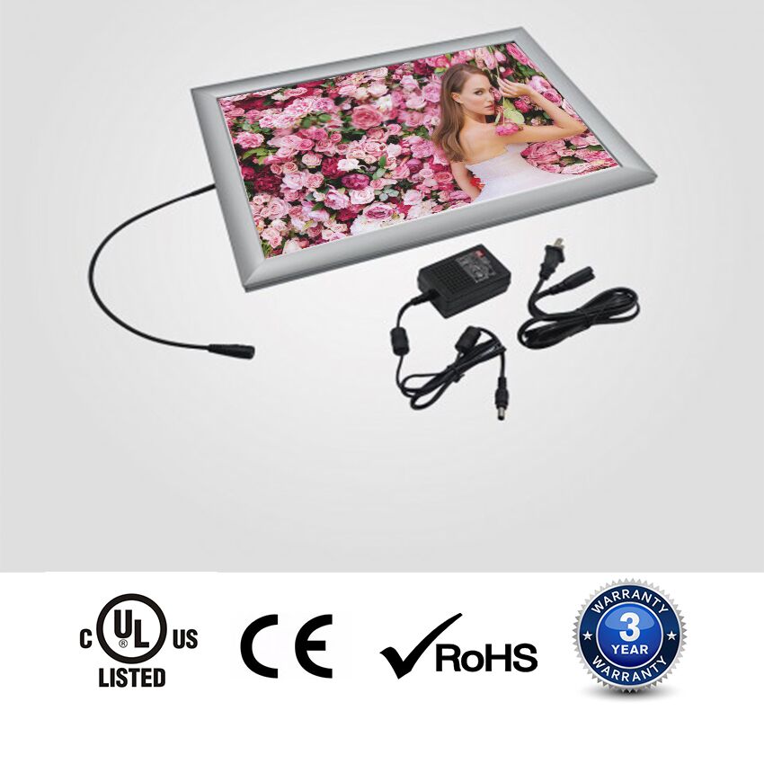 Snap frame lightbox features the high-quality LGP (Light Guided Plate) LED light panel enclosed in a flawlessly designed aluminum snap frame. Add an evenly illuminate backlight source to any printed image to attract more attention for your products or services.