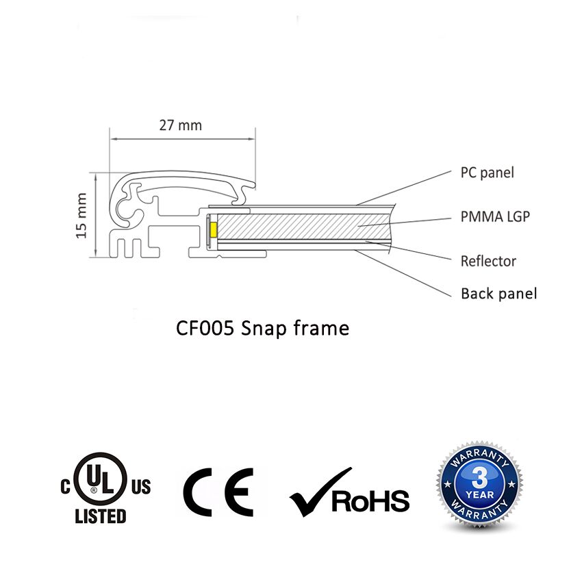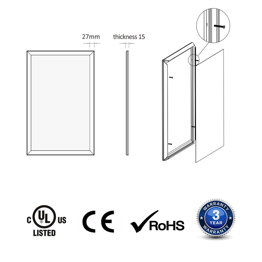 15mm single side snap frame lightbox is an ultra-thin advertisement lightbox with energy-saving light. The four-side click open offers practicality through the quick and easy changing of graphics. The main parts are LGP (Light Guide Plate), LED strip, and click aluminum frame.